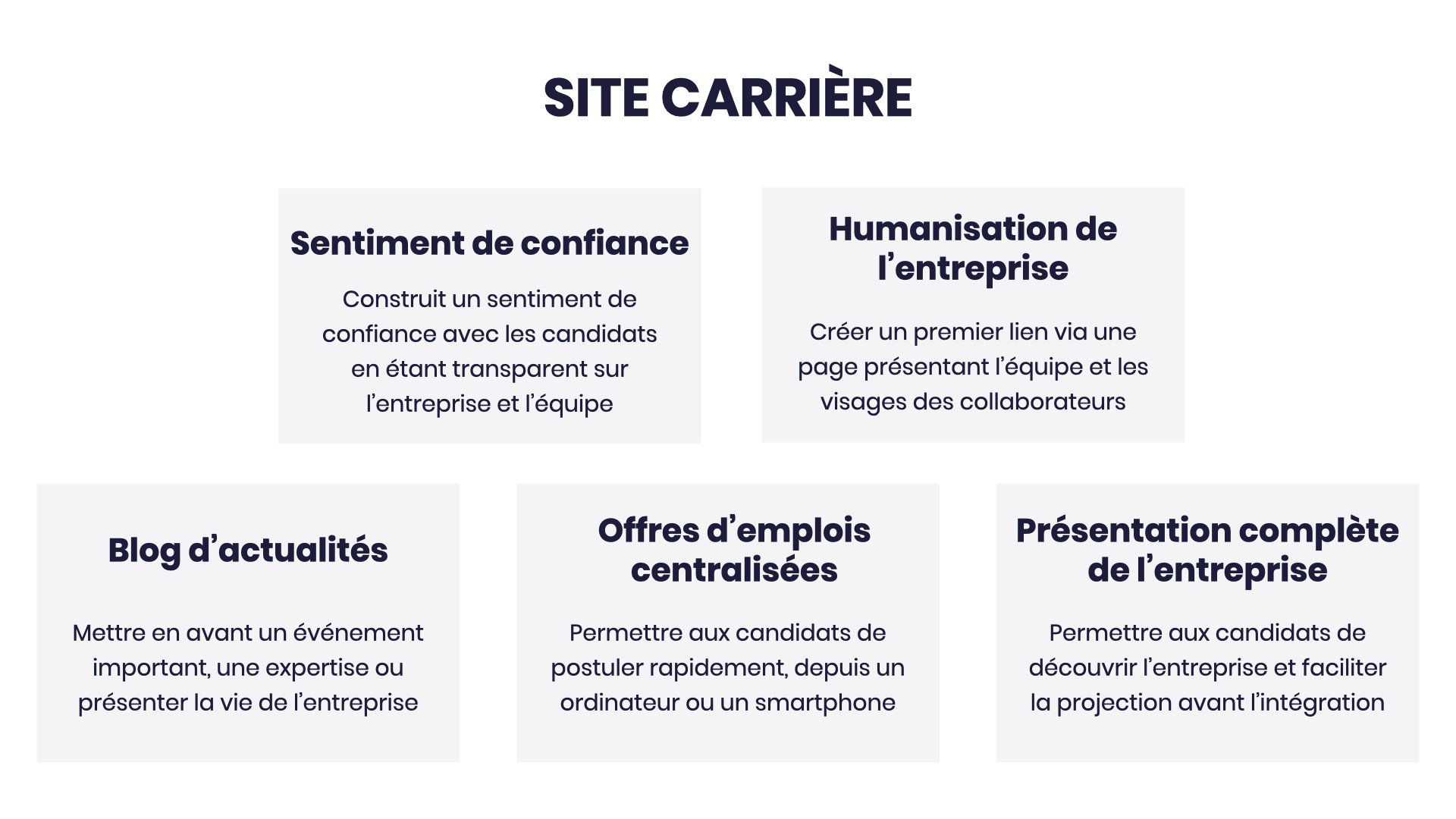 - Le site carrière permet en somme de créer un sentiment de confiance avec vos candidats en affichant de manière transparente toutes les informations sur votre entreprise et votre équipe.